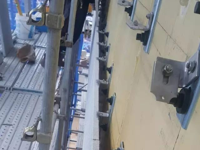 下面這幾張照片是同類的施工工藝,保溫材料采用了巖棉板,也覆蓋了防水層,板縫之間還用了發(fā)泡聚氨酯填縫。當然,這個是有主次龍骨了,繼續(xù)讓人腦洞大開的他們用于固定龍骨的角鐵居然也是直接安裝在保溫板的表面!